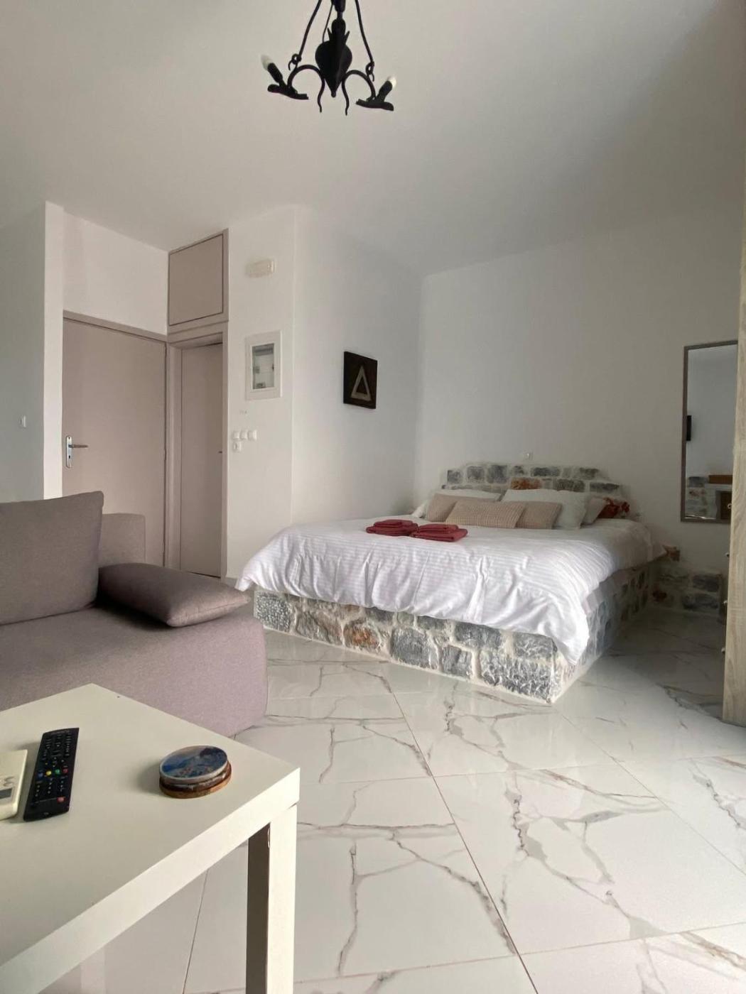 Deluxe Queen Studio. The fireplace is the standout feature of this studio. Guests will find a stovetop, a refrigerator, kitchenware and an oven in the well-equipped kitchen. The studio also features a barbecue. The studio offers air conditioning, a private entrance, a terrace with sea views as well as a private bathroom boasting a shower. The unit has 2 beds. ;